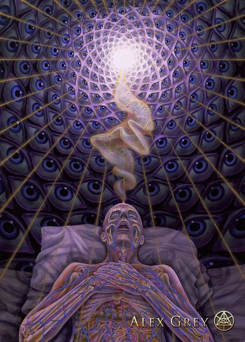 With the aid of N,N-DMT and Ayahuasca, I began to journey between the thresholds that separates the worlds. During a few particularly intense experiences, this substance showed me death. I experienced my own death and quite literally, left my body. Observing my lifeless corpse on a hospital bed, I transcended this human experience. A rainbow light tunnel made of infinite womb eyes dripping with warm golden liquid. I was met by Beings who told me to “Go back. It’s not your time yet.” No matter how "far” I went or what kind of experience it was, death always felt good when I surrendered to it. Warm, fluid, infinite, Love. There aren’t really any words to describe my experiences in this realm.